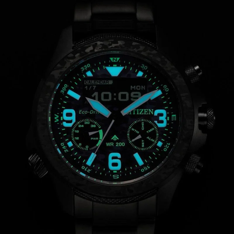 Orologio da uomo Citizen della collezione Promaster Land U822 Limited Edition. Il movimento dell'orologio è al quarzo Ecodrive (carica solare). La cassa è in acciaio IP grigio, diametro 44 mm. Il bracciale è in acciaio IP grigio. Il vetro è zaffiro con trattamento antiriflesso. Il quadrante è di colore camo con display digitale. La resistenza all'acqua è di 20 bar / 200 metri. Referenza: JV1008-63E