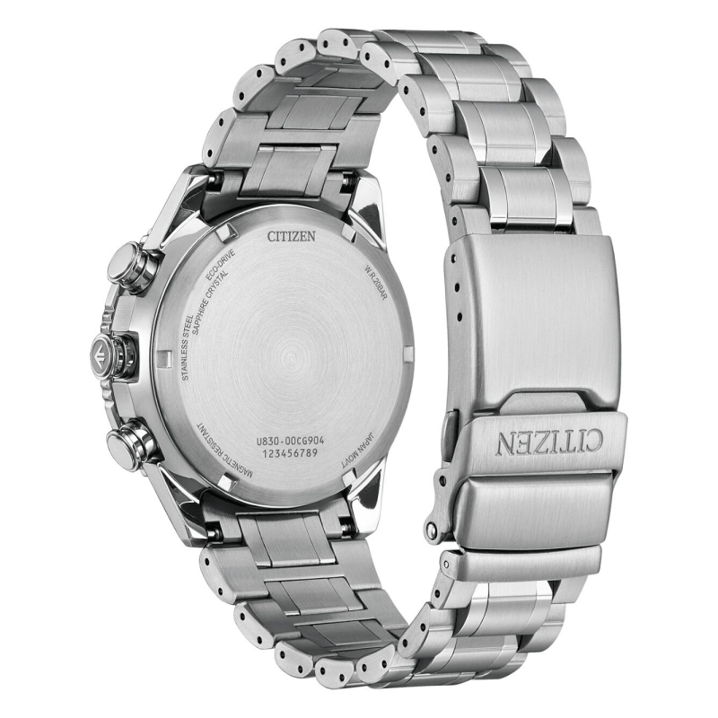 Funzioni: World Time, cronografo a 1/100 di sec fino a 24 ore, timer, allarme, calendario perpetuo, riserva di carica fino a 3 anni e indicatore energia generata.