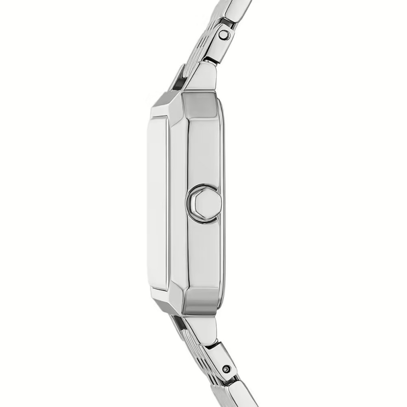 La cassa in acciaio inossidabile da 27 mm con finitura lucida tono su tono si abbina al bracciale in acciaio silver con chiusura deployante, mentre il quadrante argentato con indici a bastone dona un’estetica elegante e armoniosa, perfetta sia con look casual che formali.