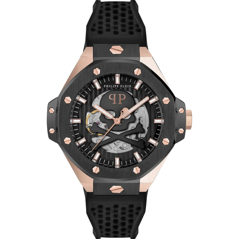La cassa in acciaio inossidabile placcato oro rosa da 44 mm con lunetta nera incornicia un quadrante scheletrato nero che mette in mostra il movimento interno e il motivo teschio centrale, simbolo iconico del brand. Il cinturino in silicone nero traforato con fibbia ad ardiglione assicura comfort e vestibilità, mentre il fondello trasparente permette di ammirare il cuore dell’orologio.