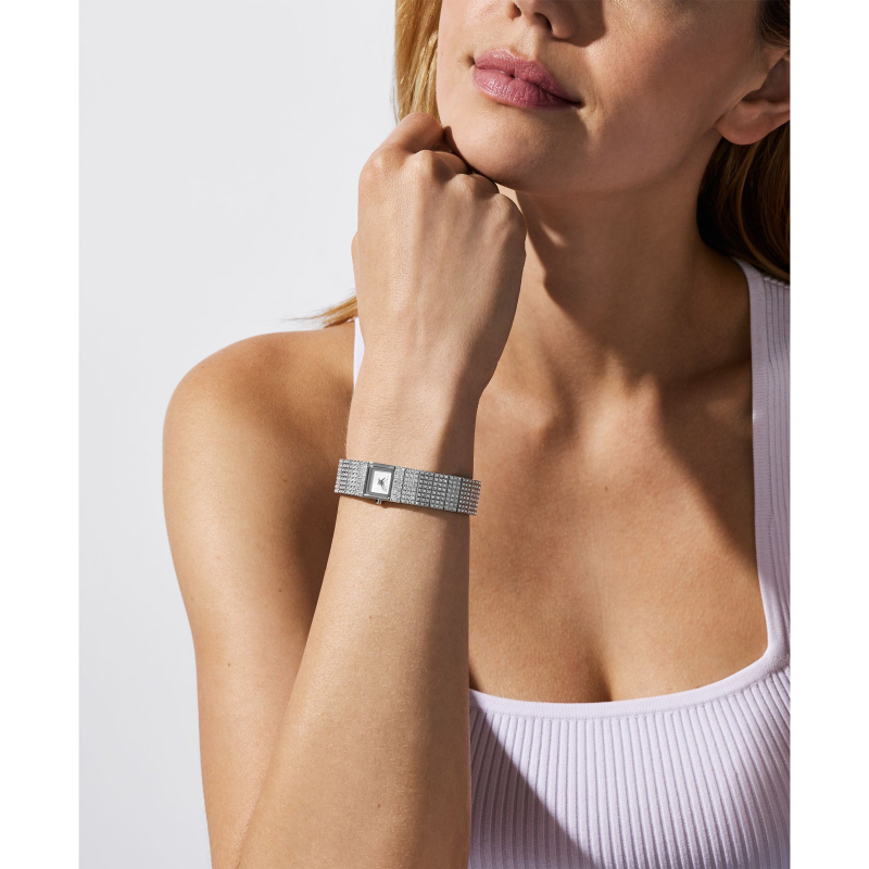 La cassa rettangolare in acciaio inossidabile da circa 14,5 mm con finitura argento ospita un quadrante silver minimalista, mentre il bracciale in acciaio con pavé di cristalli impreziosisce il look con un brillante effetto luminoso. Con chiusura deployante e vetro minerale antigraffio, questo modello unisce stile e comfort senza compromessi.