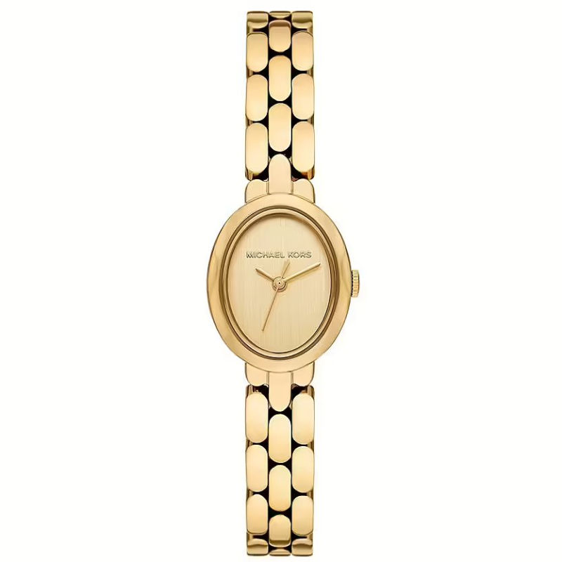 La cassa ovale in acciaio inossidabile color oro da 21 mm incornicia un elegante quadrante dorato con finitura lucida, mentre il bracciale in acciaio dorato con chiusura deployante garantisce una vestibilità sicura, comfort ottimale e un look luminoso.