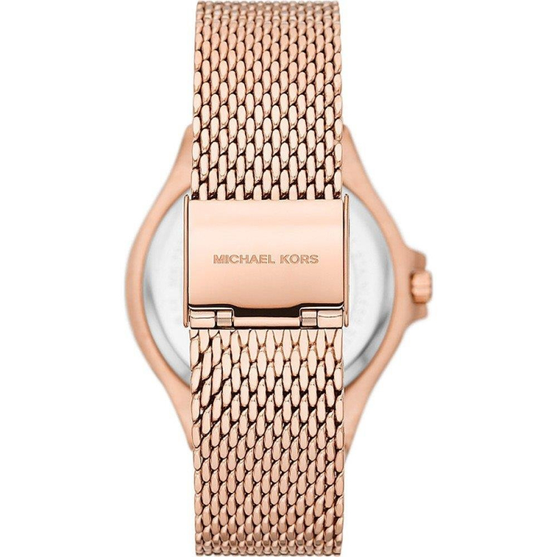 La cassa rotonda in acciaio inossidabile da 37 mm con finitura oro rosa è abbinata a un elegante quadrante oro rosa con indici a bastoni, mentre la lunetta arricchita con cristalli pavé aggiunge un tocco di brillantezza sofisticata. Il bracciale in maglia mesh tono su tono con chiusura a sicurezza offre comfort e una vestibilità elegante.