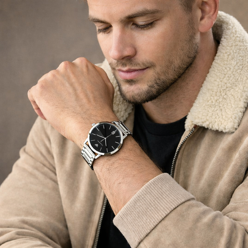 La cassa rotonda in acciaio inossidabile da 43 mm racchiude un elegante quadrante nero con indici a bastoni, mentre il bracciale in acciaio argentato con chiusura deployante offre comfort, robustezza e una vestibilità sicura. Il vetro minerale antigraffio protegge il quadrante, garantendo durabilità e leggibilità nel tempo.