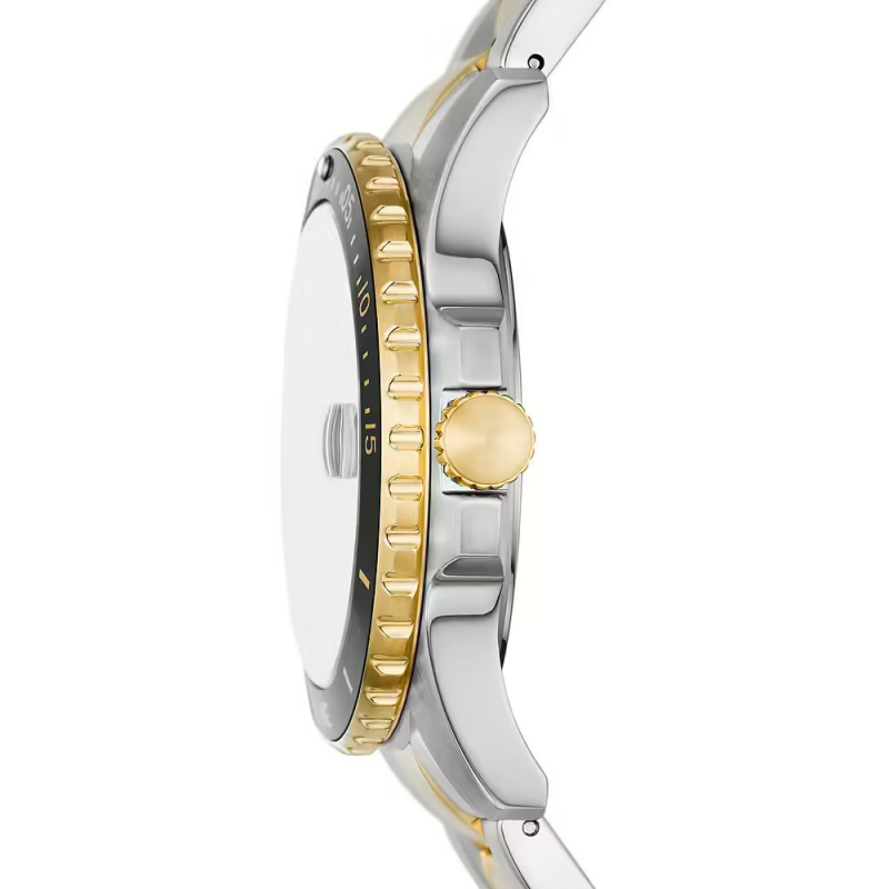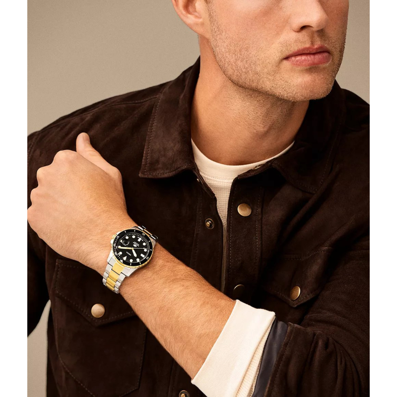 Fossil Blue Dive FS6031: bicolore acciaio e PVD oro con quadrante nero, per uno stile deciso e versatile tra città e mare. Perfetto per giornate dinamiche e weekend fuori porta, aggiunge carattere a look casual e più curati.