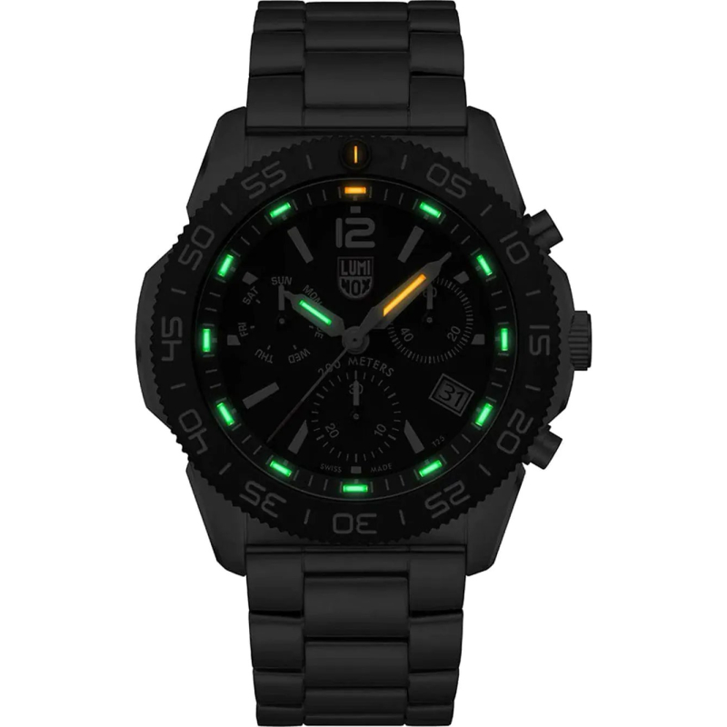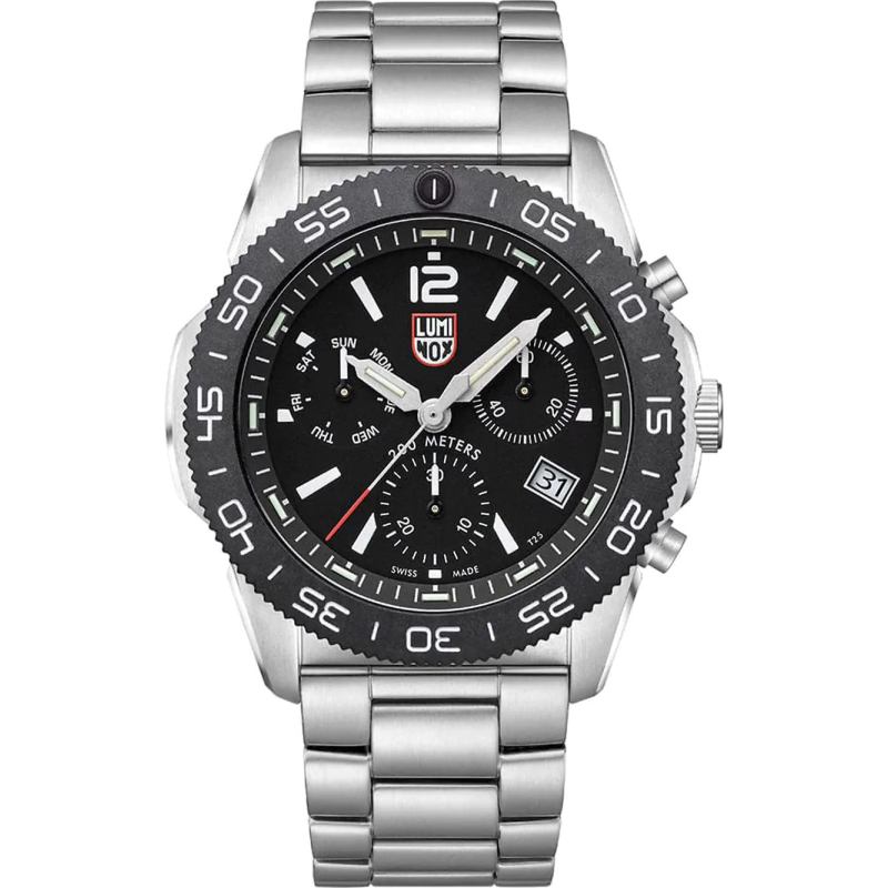 Orologio da uomo Luminox della collezione Pacific Diver. Il movimento dell'orologio è al quarzo Swiss Made con funzioni datario e cronografo. La cassa è in acciaio, diametro 44 mm. Il bracciale è in acciaio. Vetro zaffiro antiriflesso. Il quadrante è di colore nero. La resistenza all'acqua è di 20 atm / 200 metri. Referenza: XS.3142