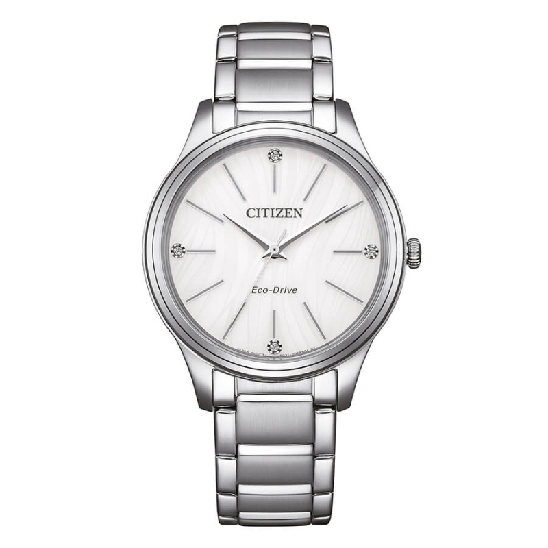 Orologio da donna Citizen della collezione OF. Il movimento dell'orologio è al quarzo Eco Drive (carica solare, riserva di carica di 180 giorni) con funzione datario. La cassa è in acciaio, diametro 34 mm. Il bracciale è in acciaio. Il quadrante è di colore bianco. La resistenza all'acqua è di 5 bar / 50 metri. Referenza: EM1220-58A