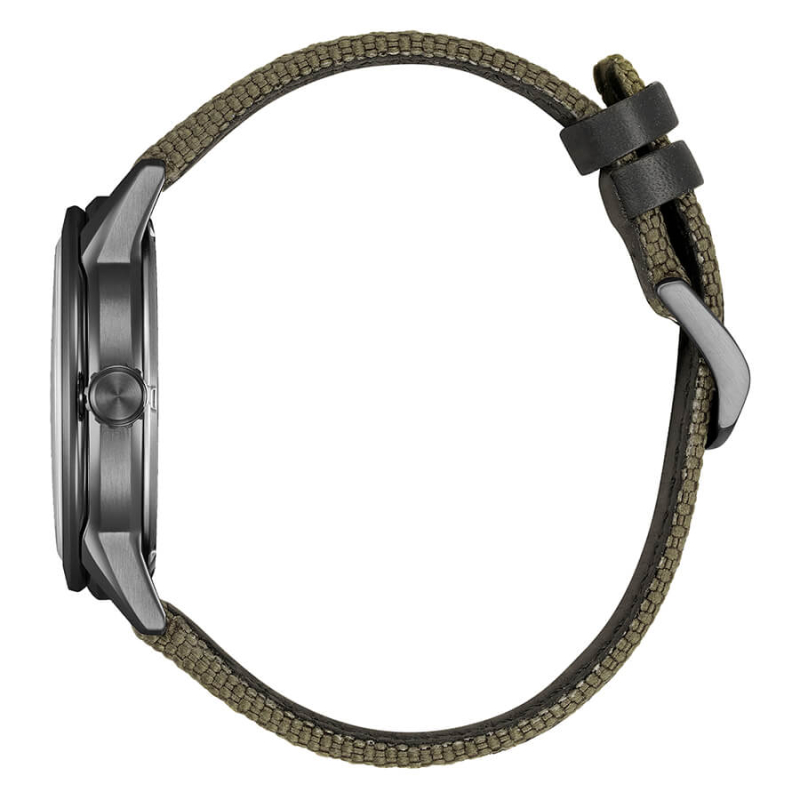 Orologio da uomo Citizen della collezione OF Field. Il movimento dell'orologio è al quarzo Eco Drive (carica solare, riserva di carica di 240 giorni) con funzione datario. La cassa è in acciaio IP nero, diametro 40 mm. Il cinturino è in pelle con rivestimento in tessuto tecnico di colore verde. Il quadrante è di colore verde. La resistenza all'acqua è di 10 bar / 100 metri. Referenza: AW1877-09X
