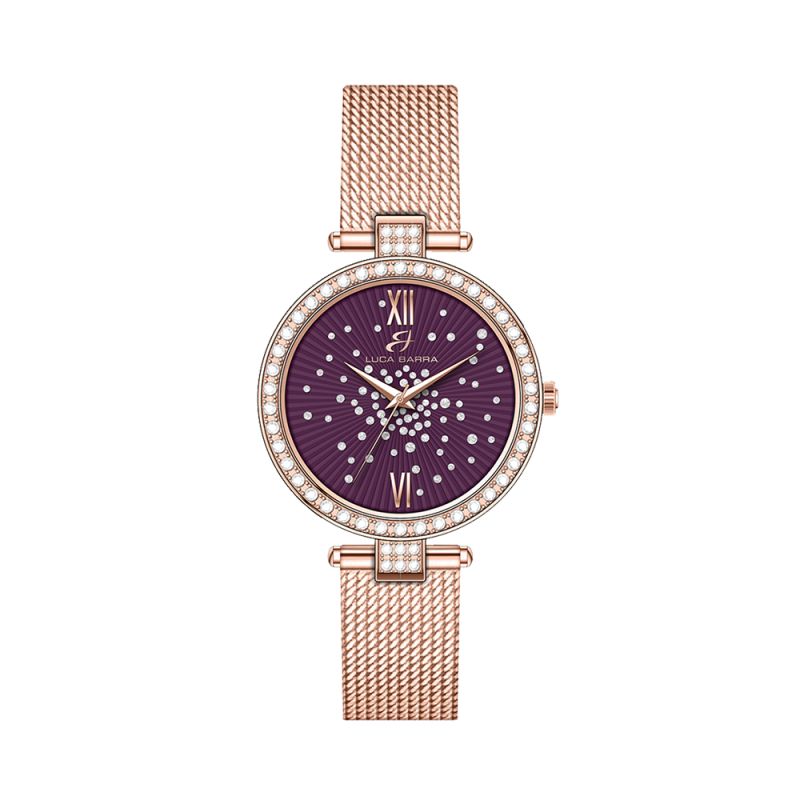 Orologio Donna in acciaio IP rose con quadrante viola, ghiera con cristalli bianchi e dettagli IP rose. Diametro cassa: 33 mm. Movimento Miyota, 5 ATM.Questo orologio in acciaio IP rose è una dichiarazione di stile e sofisticazione. Coniugando con maestria design raffinato e dettagli luminosi, questo orologio cattura l'attenzione e si distingue per la sua eleganza unica. Il quadrante viola, ricco e affascinante, crea uno sfondo straordinario per i marcatori e le lancette in acciaio IP rose, aggiungendo un tocco di calore e lusso al tuo polso. Referenza: BW358