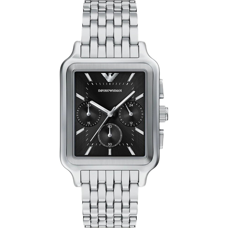 Orologio da uomo Emporio Armani. Il movimento dell'orologio è al quarzo con funzioni cronografo e indicazione delle 24h giornaliere. La cassa di forma rettangolare è in acciaio, diametro 34 mm. Il bracciale è in acciaio. Il quadrante è di colore nero. La resistenza all'acqua è di 5 atm / 50 metri. Referenza: AR11751