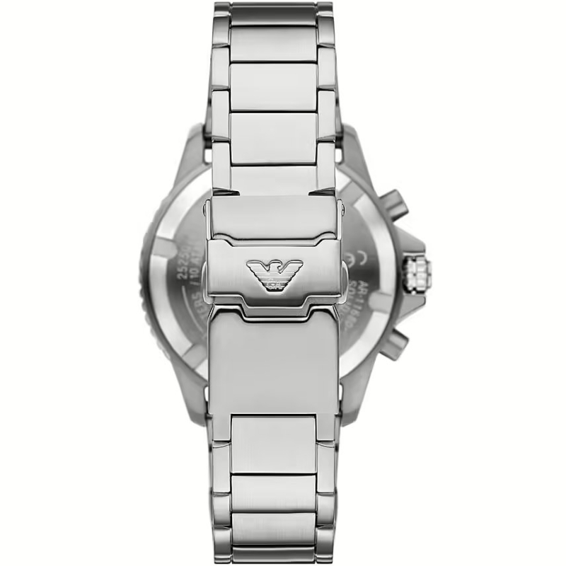 Orologio da uomo Emporio Armani. Il movimento dell'orologio è al quarzo a carica solare con funzioni datario, cronografo, indicazione delle 24h giornaliere. La cassa è in acciaio, diametro 43 mm. Il bracciale è in acciaio. Il quadrante è di colore blu. La resistenza all'acqua è di 10 atm / 100 metri. Referenza: AR11681