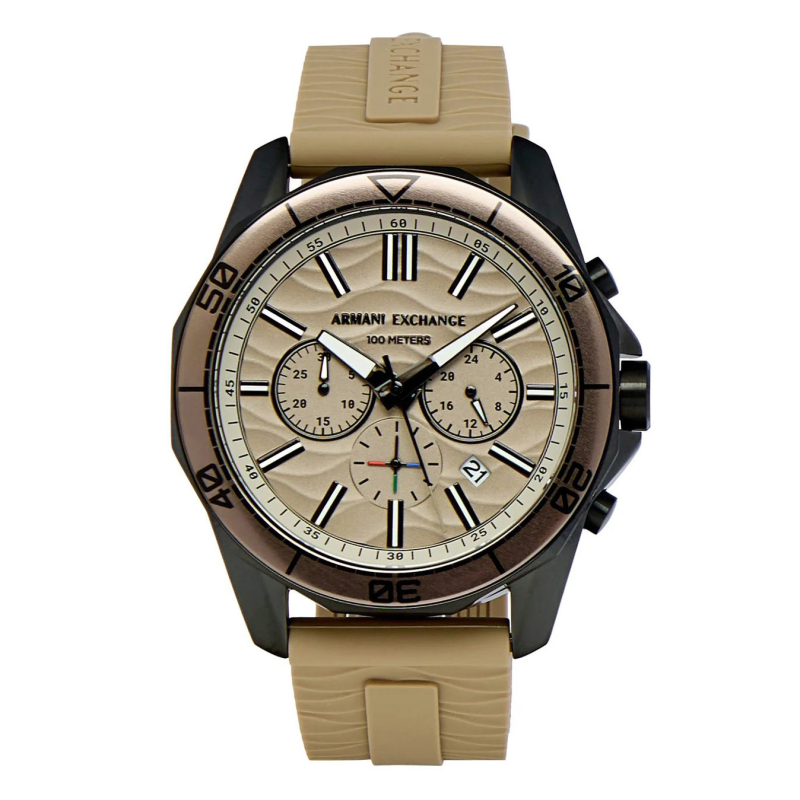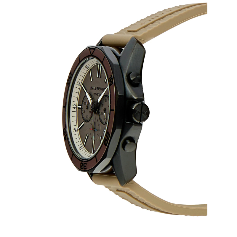 Orologio da uomo Armani Exchange della collezione Spencer. Il movimento dell'orologio è al quarzo con funzioni datario, cronografo e indicazione delle 24h giornaliere. La cassa è in acciaio IP nero, diametro 44 mm. Il cinturino è in gomma di colore beige. Il quadrante è di colore beige. La resistenza all'acqua è di 10 bar / 100 metri. Referenza: AX1971