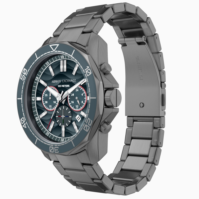 Armani Exchange Spencer AX1972: IP gun e quadrante blu per un look sportivo, moderno e deciso. Perfetto tra lavoro, tempo libero e weekend, aggiunge carattere e stile a ogni outfit.
