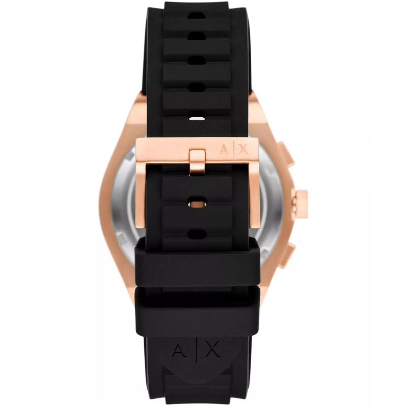 Orologio da uomo Armani Exchange della collezione Sync. Il movimento dell'orologio è al quarzo con funzioni datario, cronografo e indicazione delle 24h giornaliere. La cassa è in acciaio PVD oro rosa, diametro 42 mm. Il cinturino è in silicone di colore nero. Il quadrante è di colore nero. La resistenza all'acqua è di 5 bar / 50 metri. Referenza: AX4190