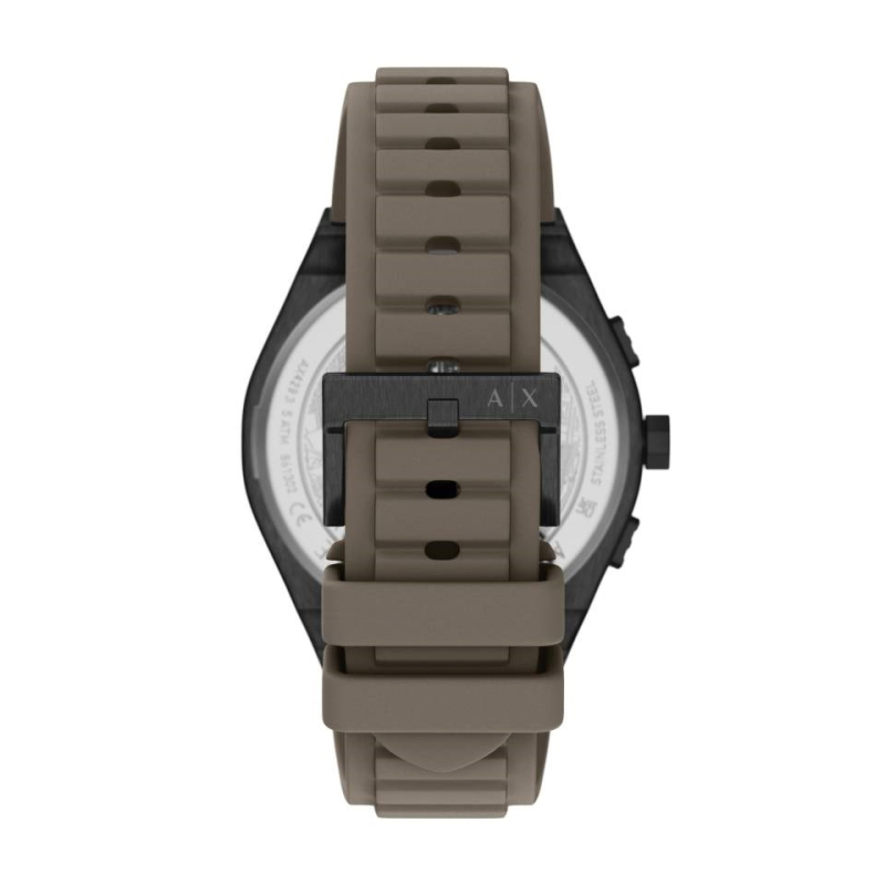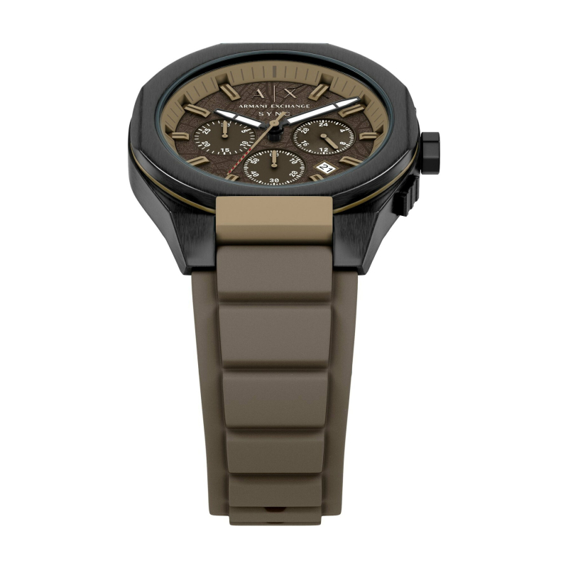 Orologio da uomo Armani Exchange della collezione Sync. Il movimento dell'orologio è al quarzo con funzioni datario, cronografo e indicazione delle 24h giornaliere. La cassa è in acciaio IP nero, diametro 44 mm. Il cinturino è in silicone di colore marrone. Il quadrante è di colore marrone. La resistenza all'acqua è di 5 bar / 50 metri. Referenza: AX4293