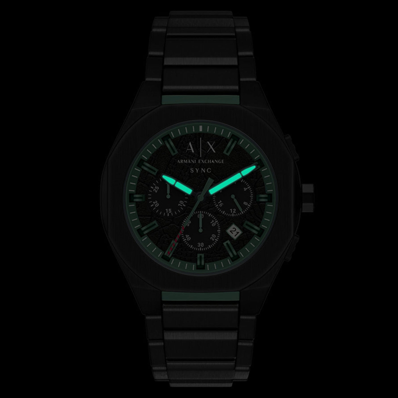 Orologio da uomo Armani Exchange della collezione Sync. Il movimento dell'orologio è al quarzo con funzioni datario, cronografo e indicazione delle 24h giornaliere. La cassa è in acciaio IP nero, diametro 44 mm. Il bracciale è in acciaio IP nero. Il quadrante è di colore nero. La resistenza all'acqua è di 5 bar / 50 metri. Referenza: AX4294