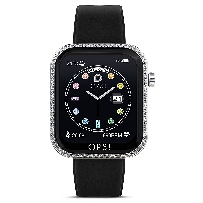 Smartwatch unisex Ops Objects della collezione Call Diamonds. La cassa è realizzata in ABS, dimensioni 40 x 45 mm. Il cinturino è in silicone di colore nero. Display 1.83" full touch. Waterproof IP67. Referenza: OPSSW-40