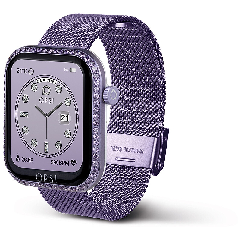 Smartwatch unisex Ops Objects della collezione Call Diamonds. La cassa è realizzata in ABS, dimensioni 40 x 45 mm. Il bracciale è in acciaio di colore viola. Display 1.83" full touch. Waterproof IP67. Referenza: OPSSW-42